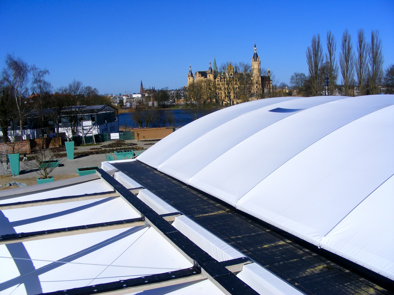 Berlin/Schwerin. Anfang April wurde die Blumenhalle für die Bundesgartenschau in Schwerin 2009 fertiggestellt. Nach 6 Wochen Bauzeit wurde die dreischiffige leichte Holzkonstruktion mit geschwungenen Leimbindern ihrer Nutzung als Ausstellungshalle für Blumenschauen übergeben. Dach und Fassaden der Halle sind mit einer weißen Membran bespannt.
